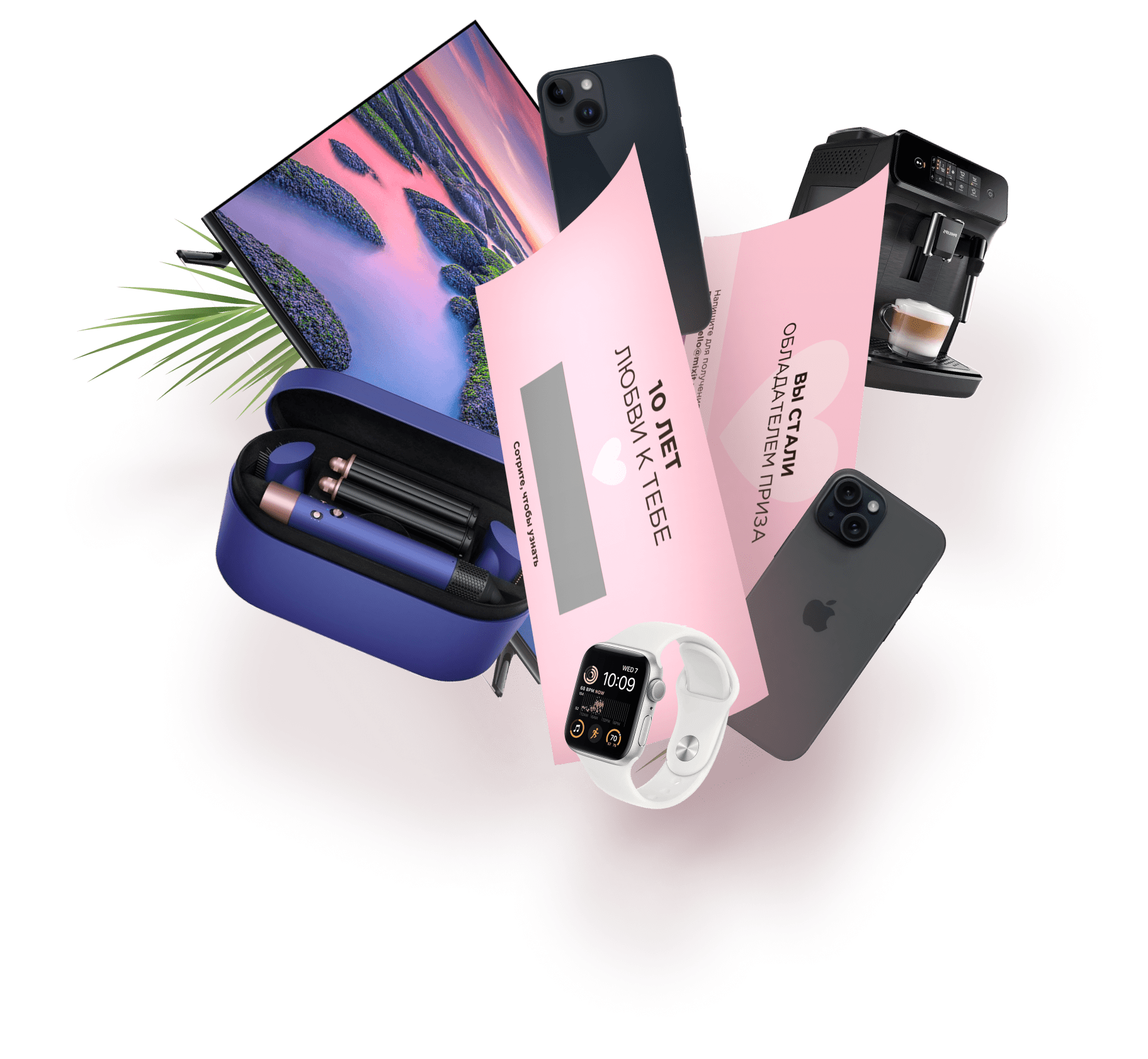 Мы приготовили для вас 600 приветственных баллов в Программе лояльности, денежные призы, стайлеры Dyson Airwrap Complete Long HS05, Airwrap Complete Long HS05 и Dyson Airwrap Complete Long HS05, телефоны Apple iPhone 15 и Apple iPhone 14, кофемашину Philips. А также Apple Watch SE, телевизор Xiaomi Mi TV A2 и курс «Сам себе косметолог».